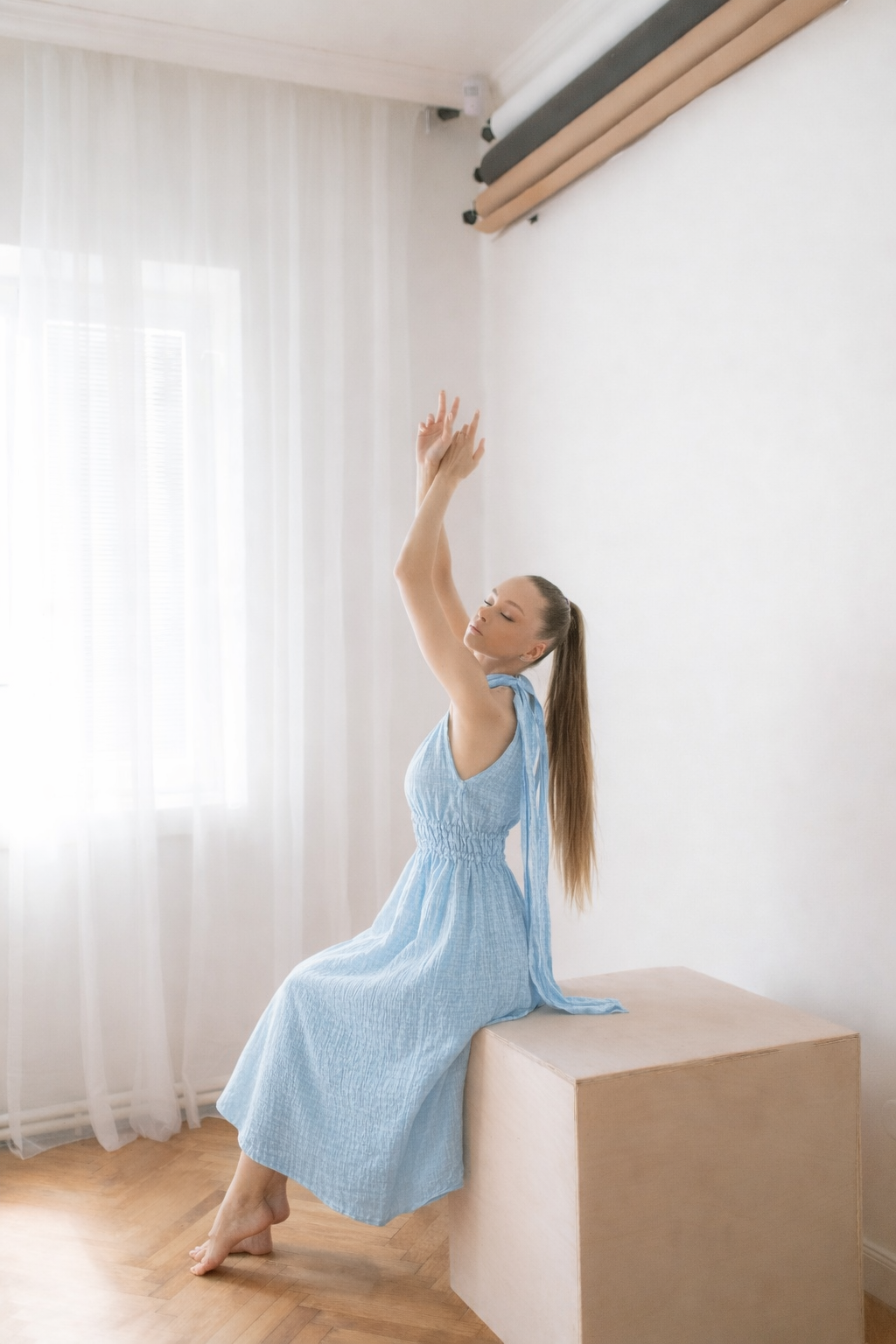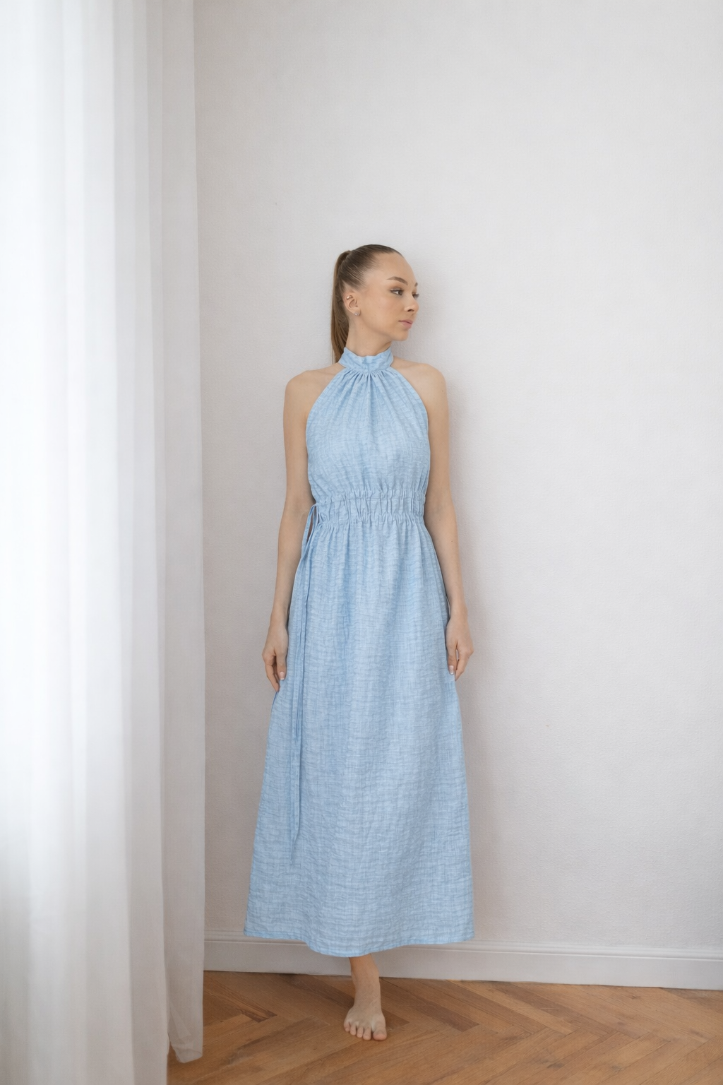 Tieto letné mušelínové šaty s viazačkou sú stelesnením ľahkosti, pohodlia a jemnej ženskosti. Vyrobené z príjemného, priedušného mušelínu, sú ideálnou voľbou na teplé letné dni. Šaty sú podšité bavlneným plátnom, vďaka čomu zabezpečujú komfort pri nosení a zároveň nepresvitajú.