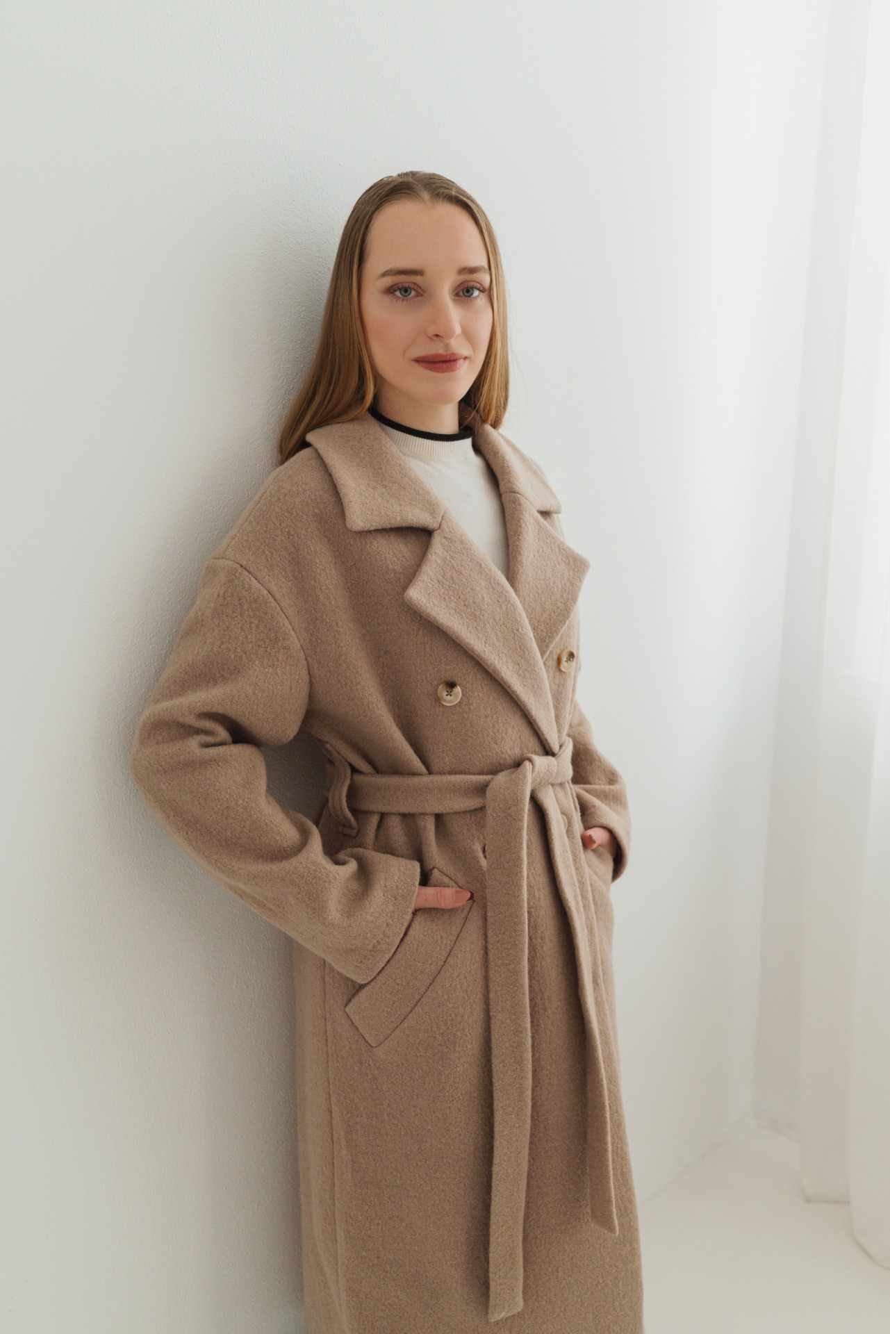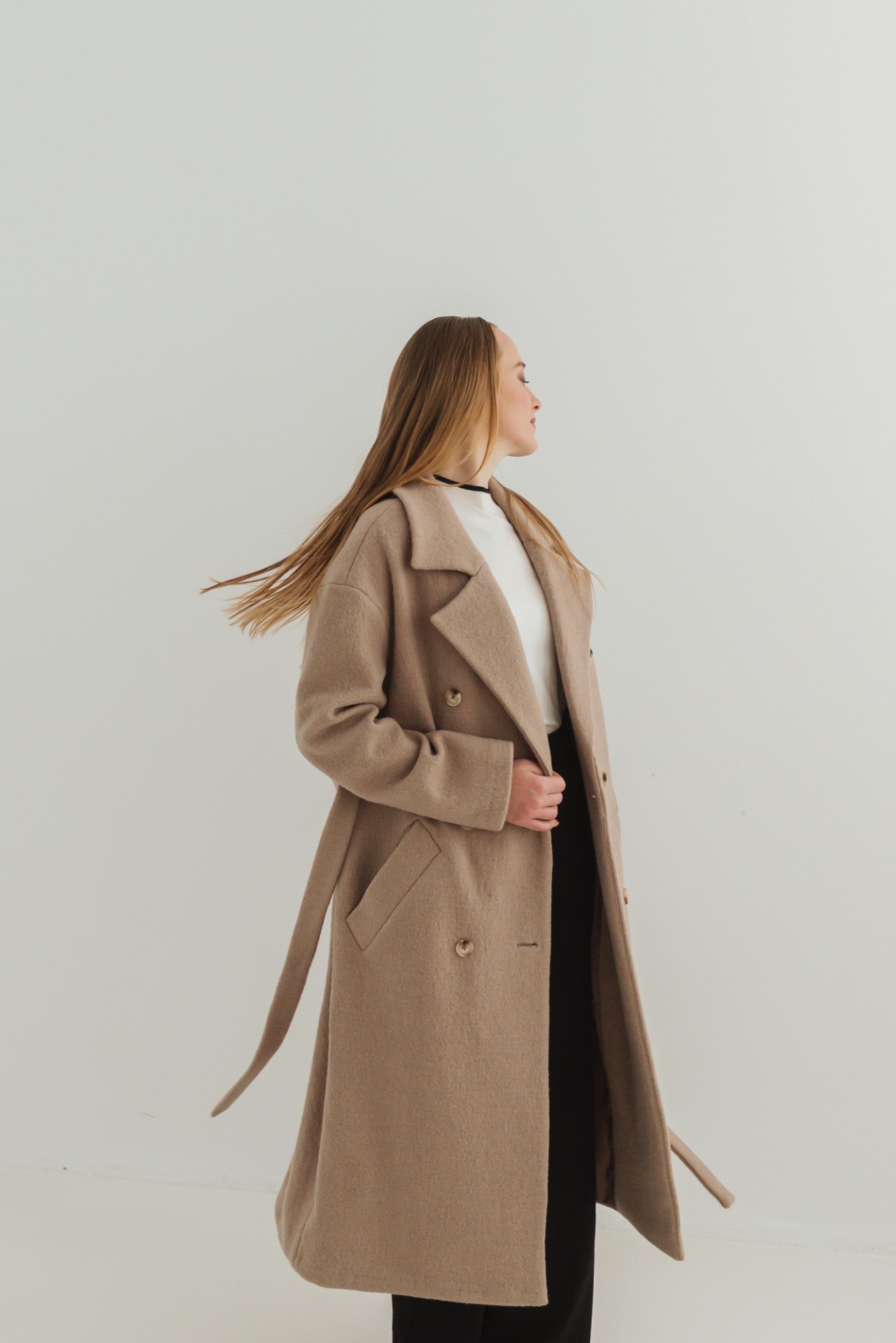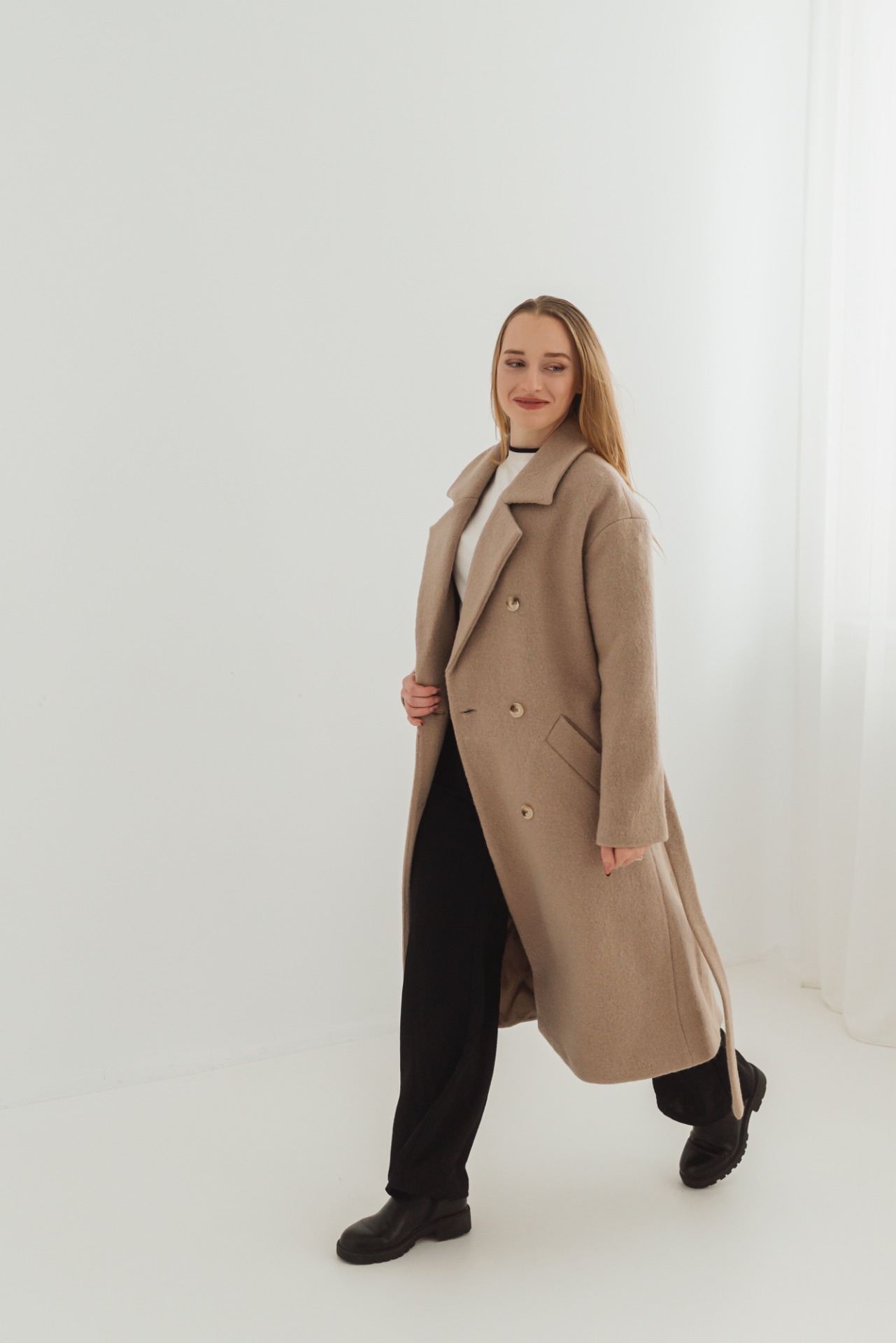 Elegantný dlhý dámsky kabát s dvojradovým zapínaním a fazónovým golierom je nadčasový kúsok, ktorý zvýrazní ženskú siluetu. Voľnejší strih je možné stiahnuť opaskom v páse, vďaka čomu sa kabát dá prispôsobiť postave a pôsobí žensky a sofistikovane. Na oboch stranách sa nachádzajú praktické lištové vrecká. Spadnuté rukávy dodávajú modelu moderný, uvoľnený vzhľad. Na zadnom diely sa nachádza rázporok, ktorý zaisťuje pohodlný pohyb.