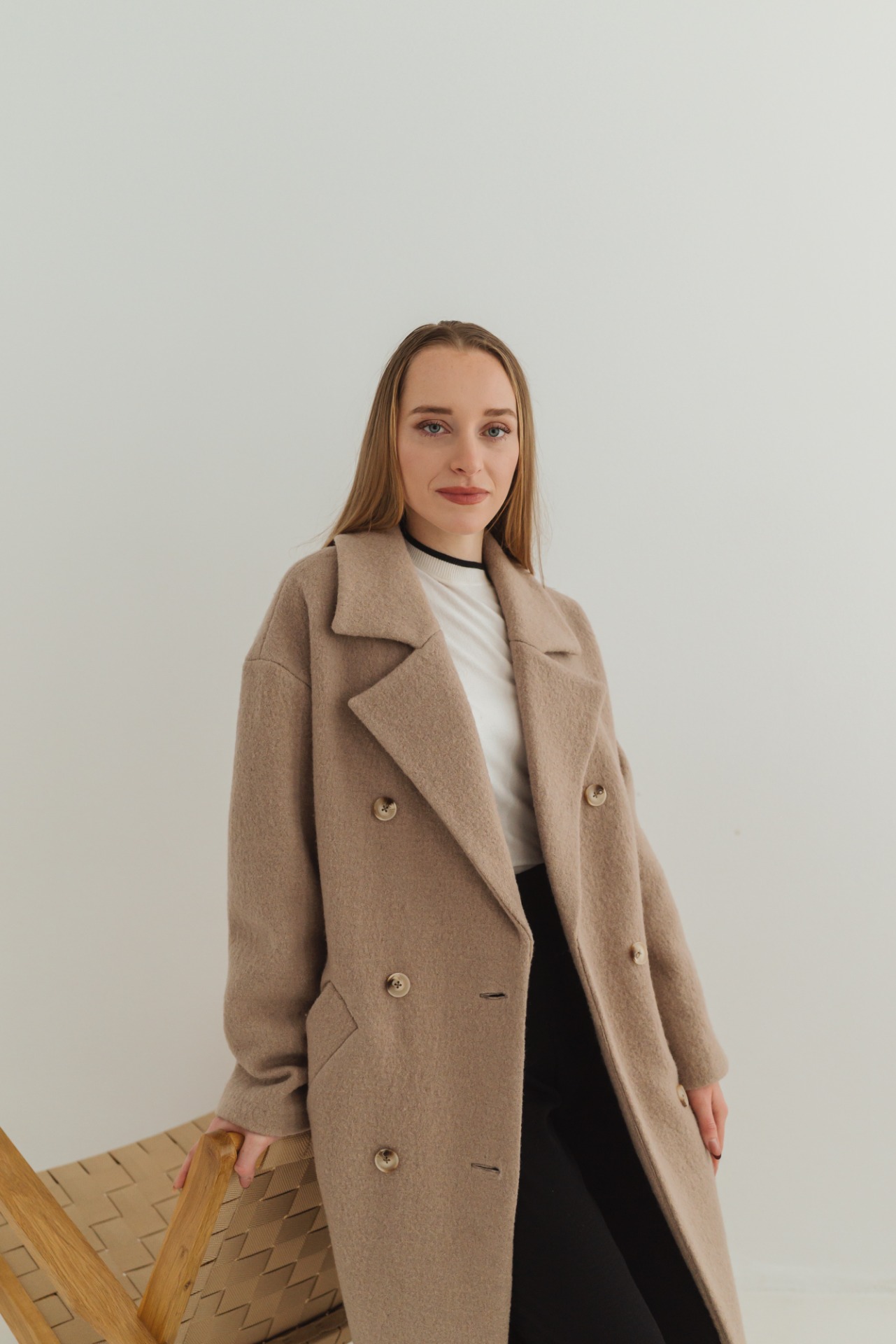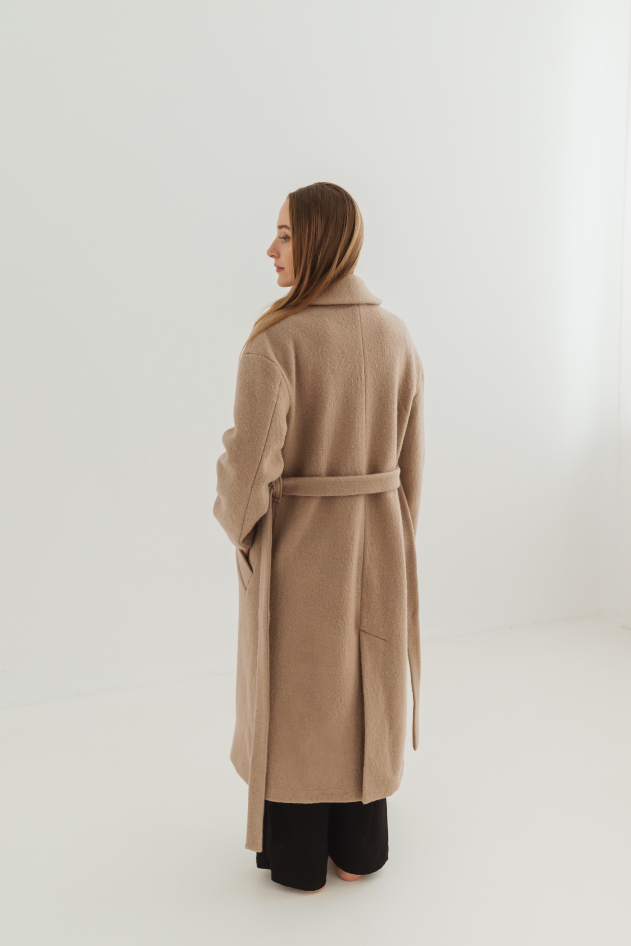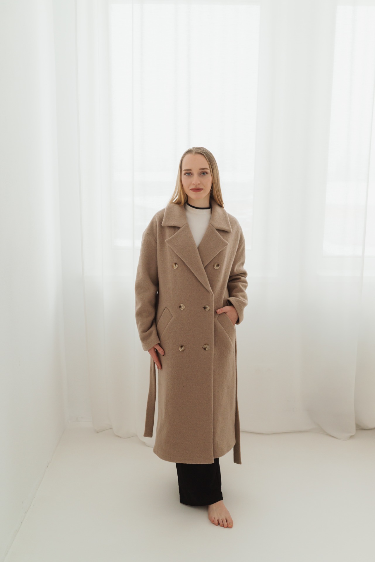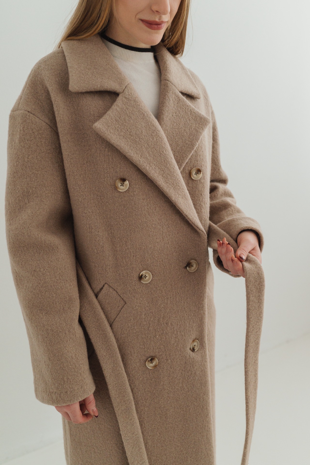 Elegantný dlhý dámsky kabát s dvojradovým zapínaním a fazónovým golierom je nadčasový kúsok, ktorý zvýrazní ženskú siluetu. Voľnejší strih je možné stiahnuť opaskom v páse, vďaka čomu sa kabát dá prispôsobiť postave a pôsobí žensky a sofistikovane. Na oboch stranách sa nachádzajú praktické lištové vrecká. Spadnuté rukávy dodávajú modelu moderný, uvoľnený vzhľad. Na zadnom diely sa nachádza rázporok, ktorý zaisťuje pohodlný pohyb.