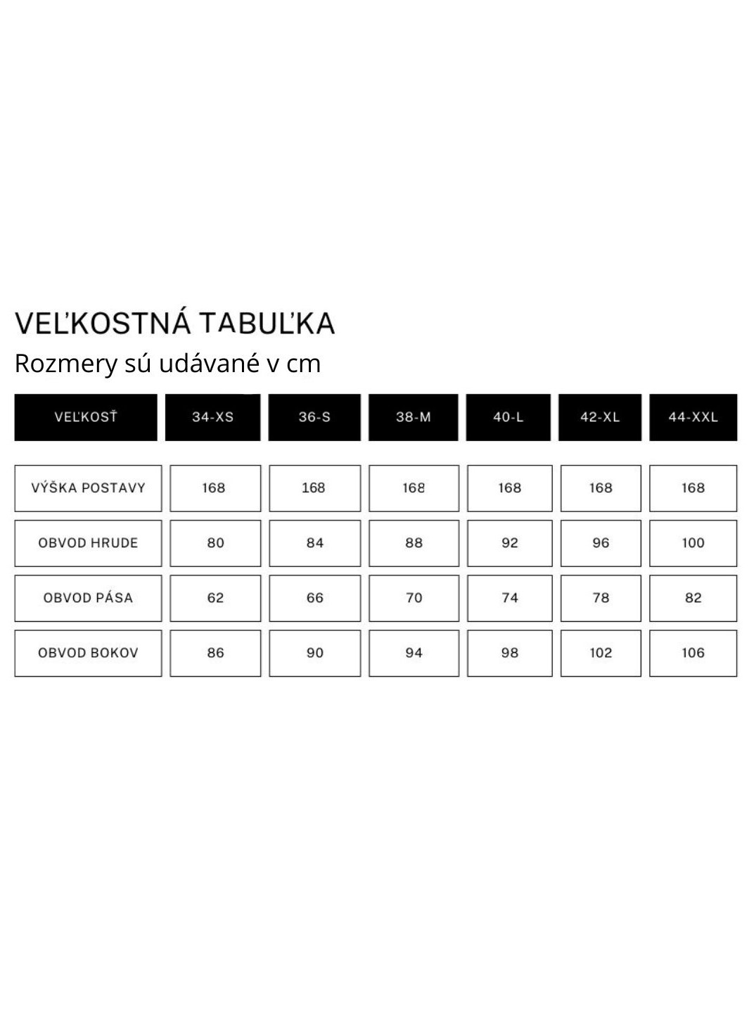 *Ak sa vaša veľkosť nezhoduje s veľkosťami v tabuľke, môžete pri objednávke zadať svoje presné miery a daný kúsok Vám bude ušitý na mieru. Rovnako to platí, ak máte menšiu alebo väčšiu veľkosť, ktorá sa nenachádza v tabuľke.